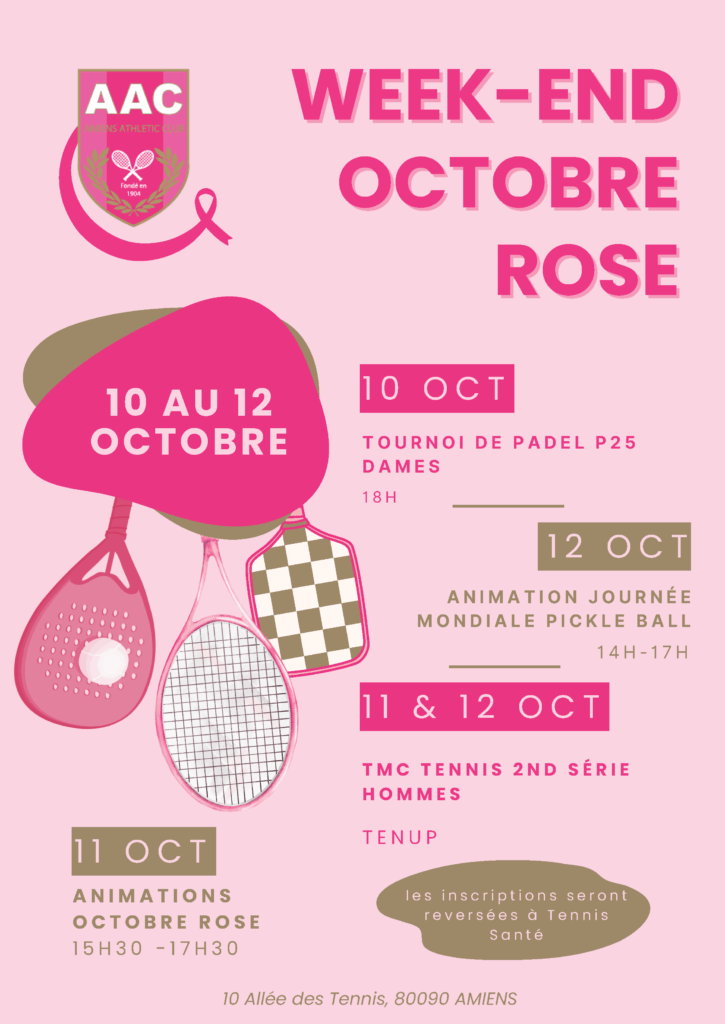 À l’occasion d’Octobre Rose, l’AAC mobilise ses courts et sa communauté du vendredi 10 au dimanche 12 octobre 2025 pour trois jours d’animations sportives et solidaires au profit de la lutte contre le cancer du sein.